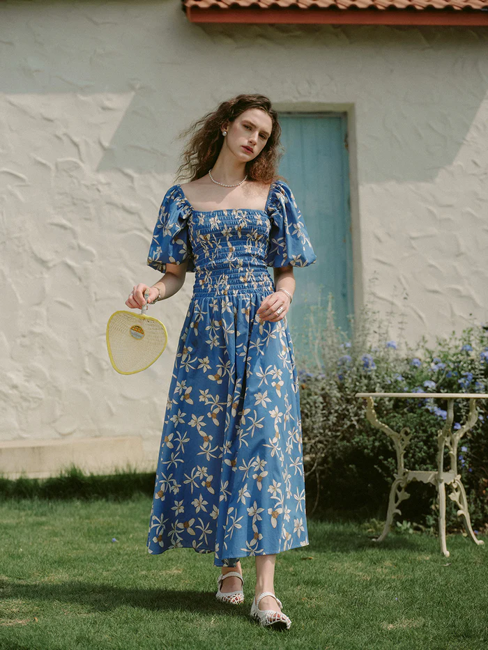 Design: Square neckline; short puff sleeves with elastic cuffs; The bodice has elastic. 100% polyester floral pattern for lining