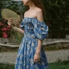 Design: Surrounds the hem and secures with a side knot. Short puff sleeves and floral V-neckline