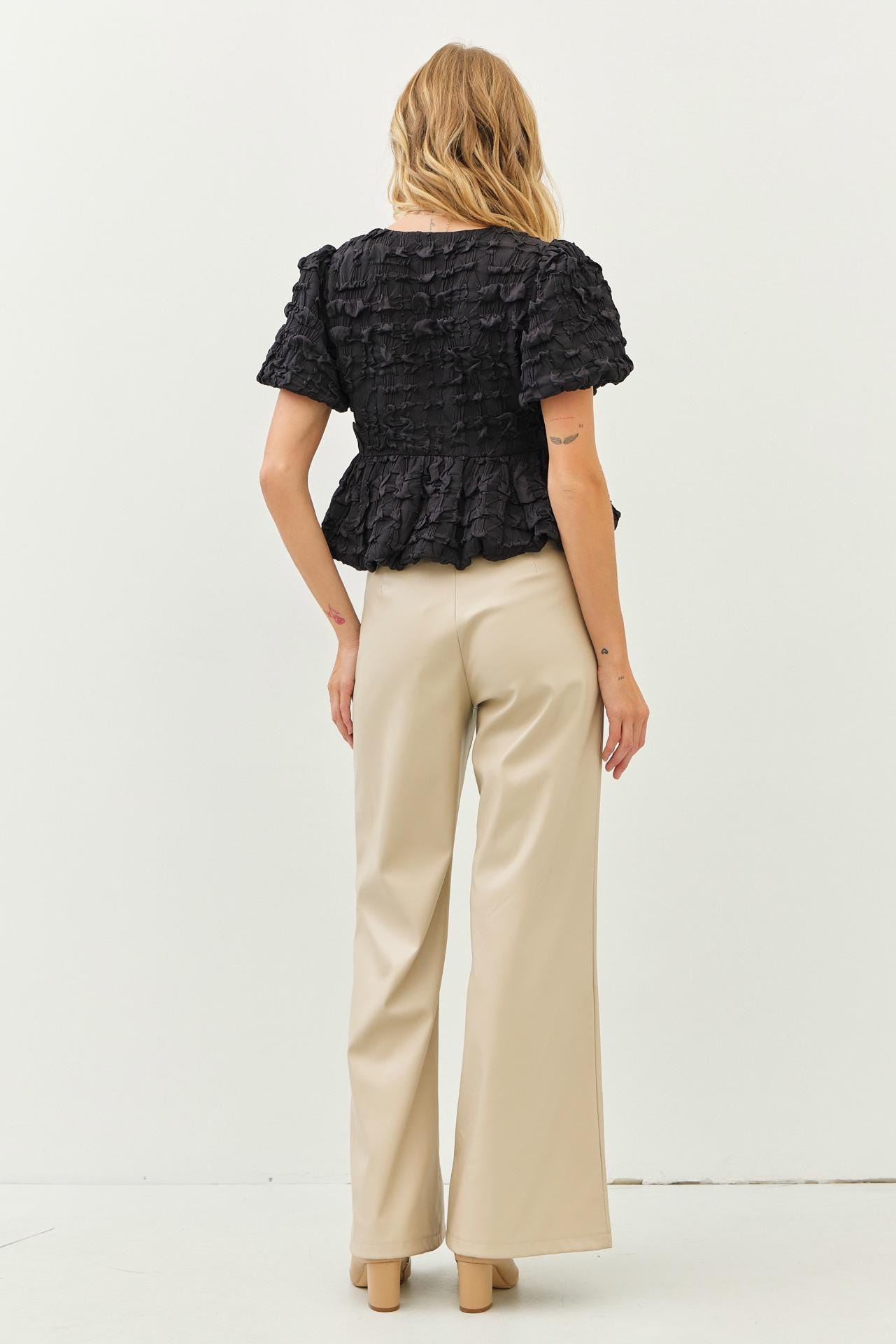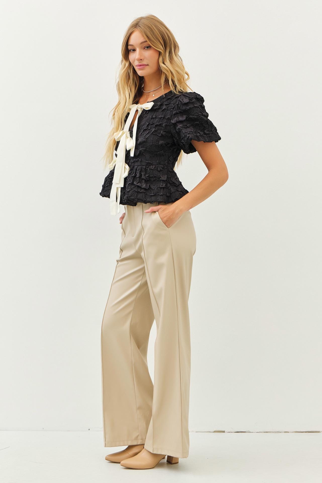 Elevate your wardrobe with our most loved blouse—a true best seller since last year. Designed for effortlessly romantic moments, this textured babydoll-style top features playful bubble sleeves, a flattering silhouette, and an eye-catching contrast bow tie front. Whether you’re dressing up for a wedding, graduation, or a special date, this top makes you feel feminine, confident, and unforgettable.