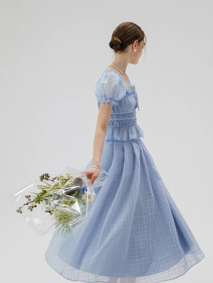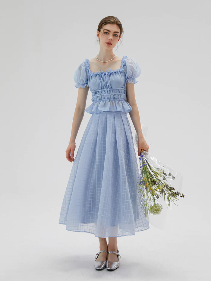 Design: Puff-sleeved shirt with ruffled waist, moderately flared skirt, two flowing layers