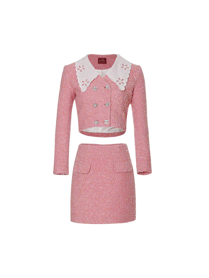 Elegant and seductive style with non-stretch tweed, neckline, button pockets, front faux flap pockets and hidden zip at the back 100% polyester for lining